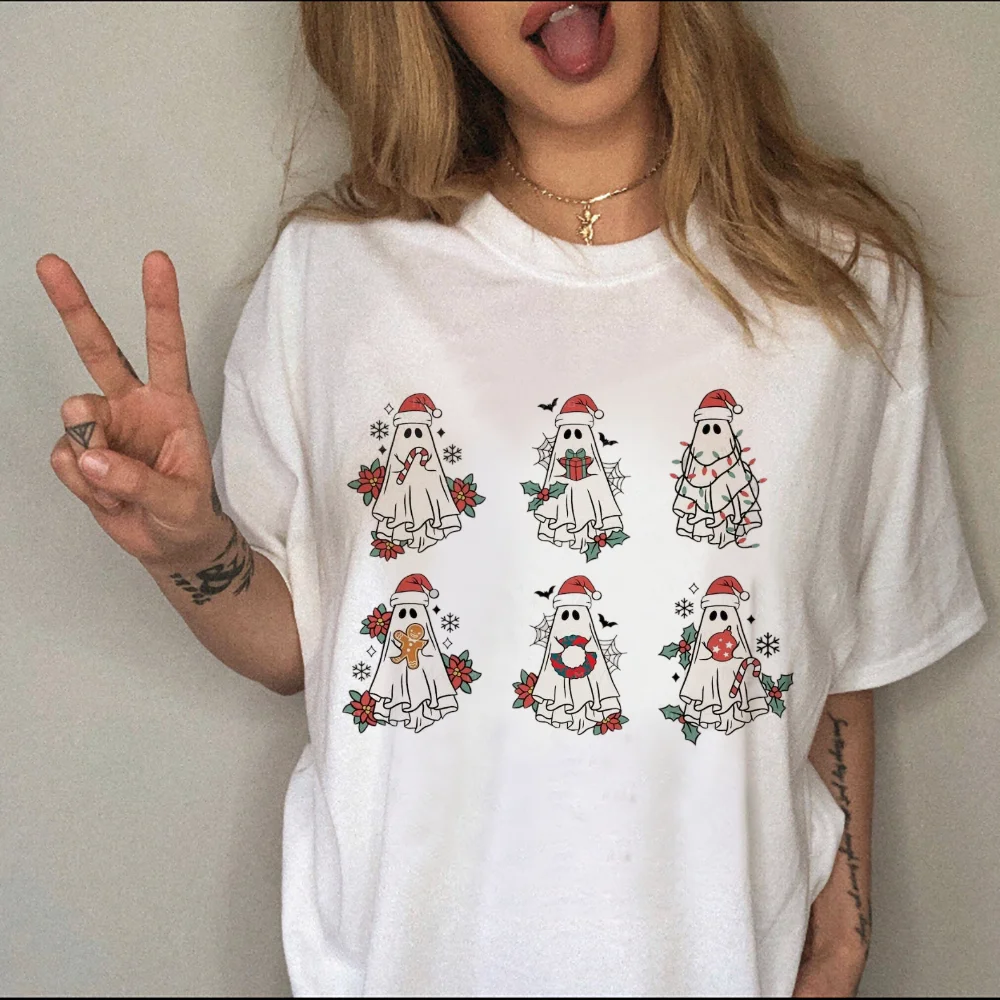 Harajuku Versatile Printed O-Neck Women’s New Year’s Fashion Shirt T-Shirt Casual Christmas Clothing Cute Ghost Pattern T-Shirt